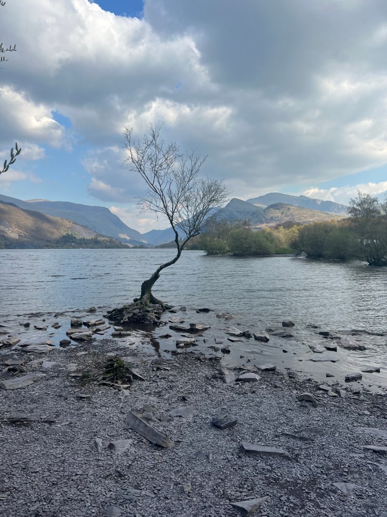From Dolbadarn, Robin and I drove into Llanberis, found The Lonely Tree and the Blade of the Giants. The Lonely Tree is an Instagram thing that I had discovered, possibly the most photographed tree in the world. Both the tree and the Blade of the Giants were on the banks of Llyn (Lake) Padarn. The whole valley was beautiful.