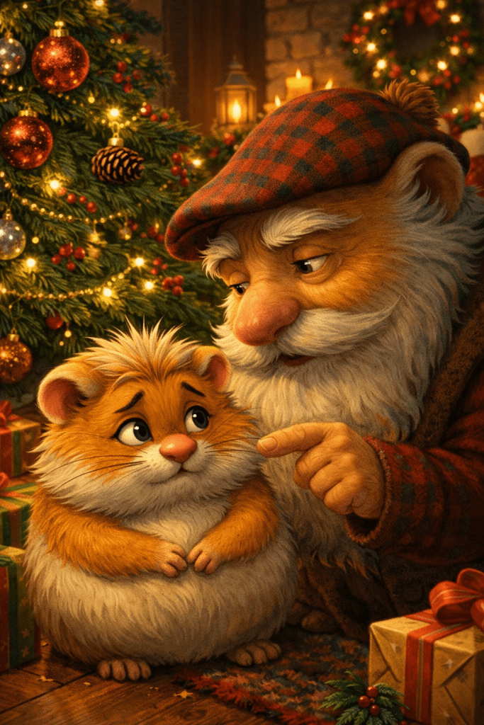 Haimish had covered the gift up and pushed it back under the tree. He is sitting by the fireplace, trying not to look guilty.