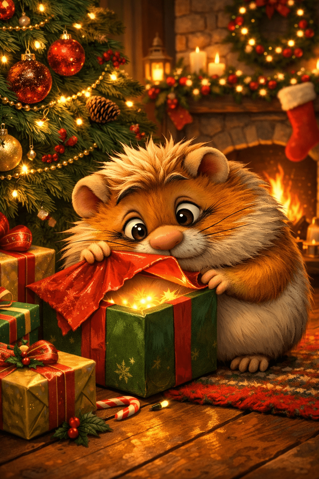 Haimish comes into the family room. There’s no one there. There’s a fire going in the fireplace, but the sound of the fire is the only sound. He’s acting sneaky, looking around to see if anyone is nearby, then slowly creeping toward the Christmas tree. He sees one of his presents under the tree and slowly pulls it out. Looking around again, he leans over the gift.