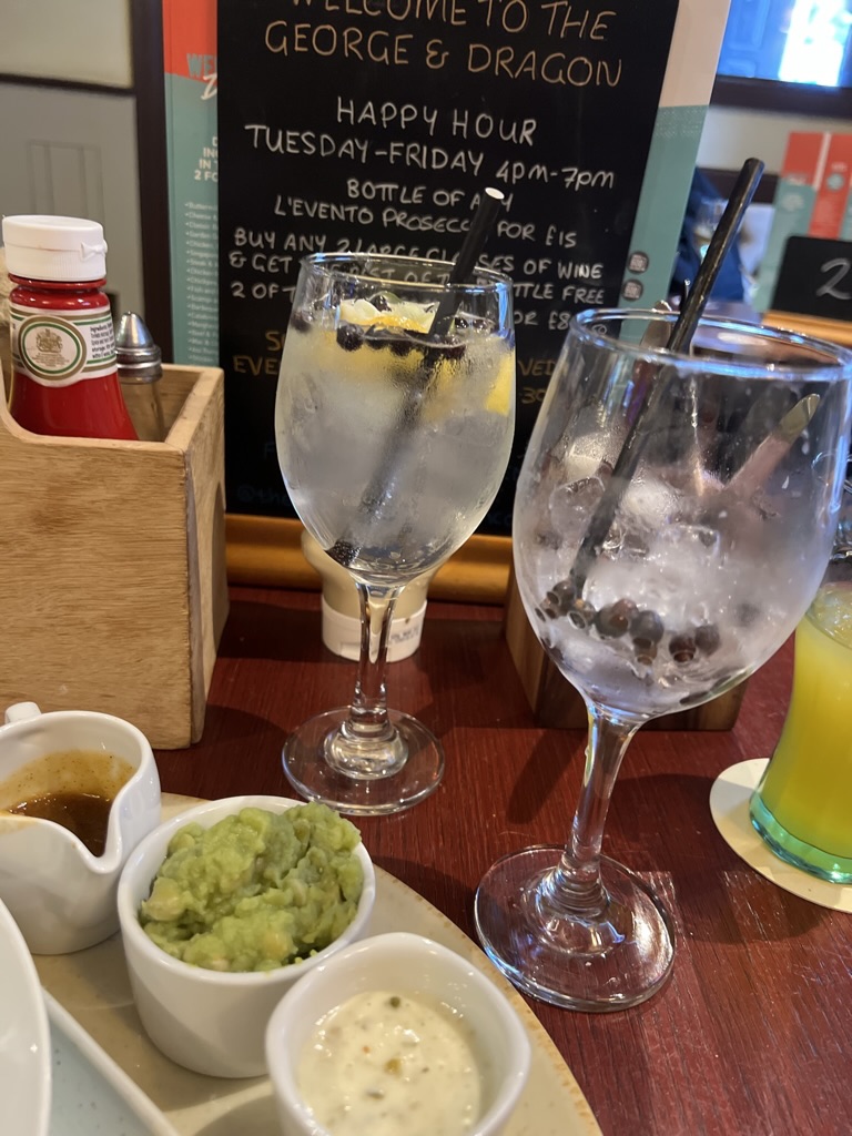We ordered some food, and they had a drink special so I got a BOGO on an English Fizz, a drink made with Torquay Gin and served over ice, with peppercorns. I don’t drink cocktails often, and they are usually whiskey-based when I do. My good friend George McFarley is an avid gin aficionado, so I got these drinks in his honor. Yeah, that’s why…