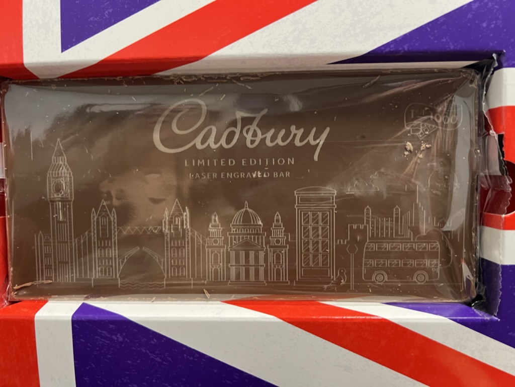 The hotel had a shuttle bus to the terminal, so we bundled our bags on board and off we went. We got checked in with the airline, went through the British version of TSA, and made our way toward our gate. Our path took us through the World Duty-Free Heathrow, a wonderful, capitalistic experience that everyone should do, at least once. I would have purchased some more single malt, but we were already at our limit, luggage-wise. Robin did get a laser-etched Cadbury bar. Only a thousand were made, and hers was like #480. It was etched with icons of London, in honor of the King’s Coronation which was happening the following week.