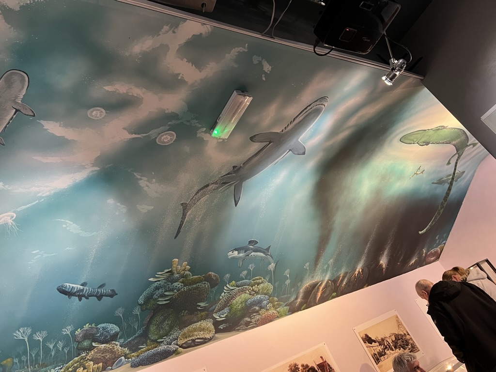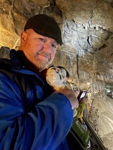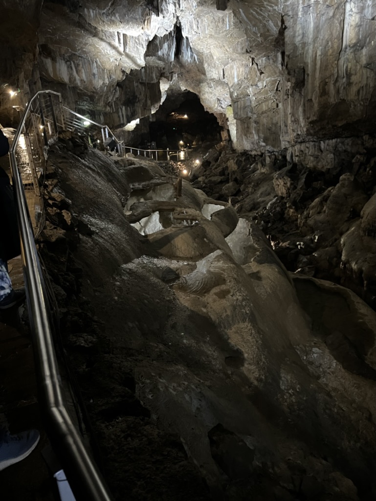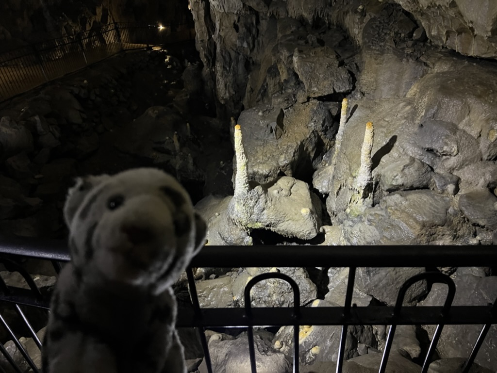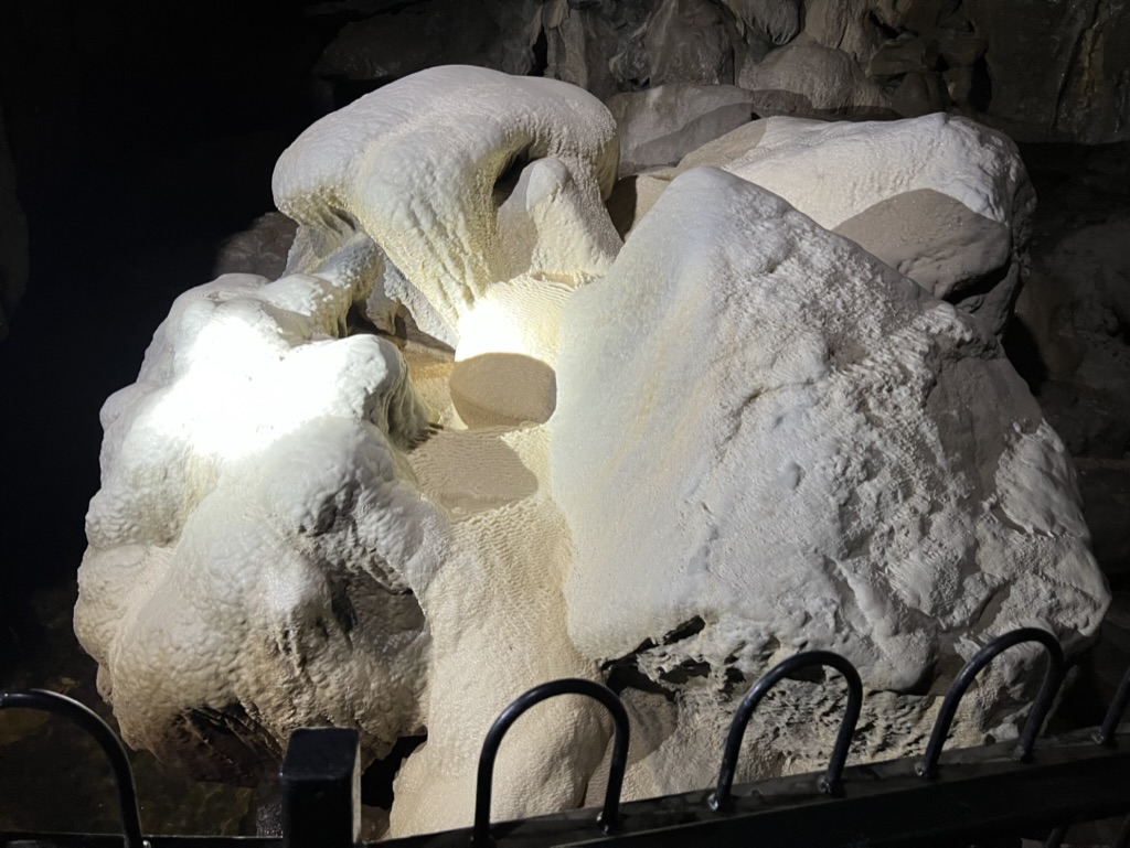 All I know is, there were some goofy looking prehistoric animals…the Shark-mander, Gator-Shark, Frog-newt, etc.Poole’s Cavern, in all it’s glory!Ranger checking in with the only place in the world with stalagmites that have this color on therm.A large calcite deposit. The water in the middle was forming mini brimstone dams.