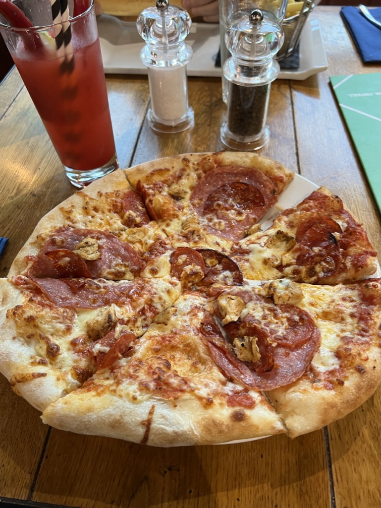 I started my dinner off with a Red Devil, a cocktail that was topped off with a couple of red peppers. Why? Because Manchester United, that’s why! It was perfectly paired with my meat pizza. Robin was laughing at me, which is preferable to the climate-changing mood I often cause. I’ll take her smile any day!