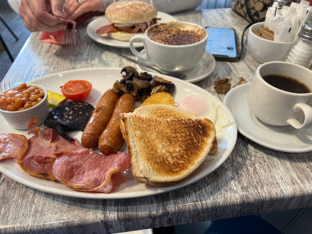 Robin had the Bacon Bap(sandwich) with a cappuccino. I had an egg with bacon, sausage, beans and toast and black pudding, with a mocha. Ranger just watched.