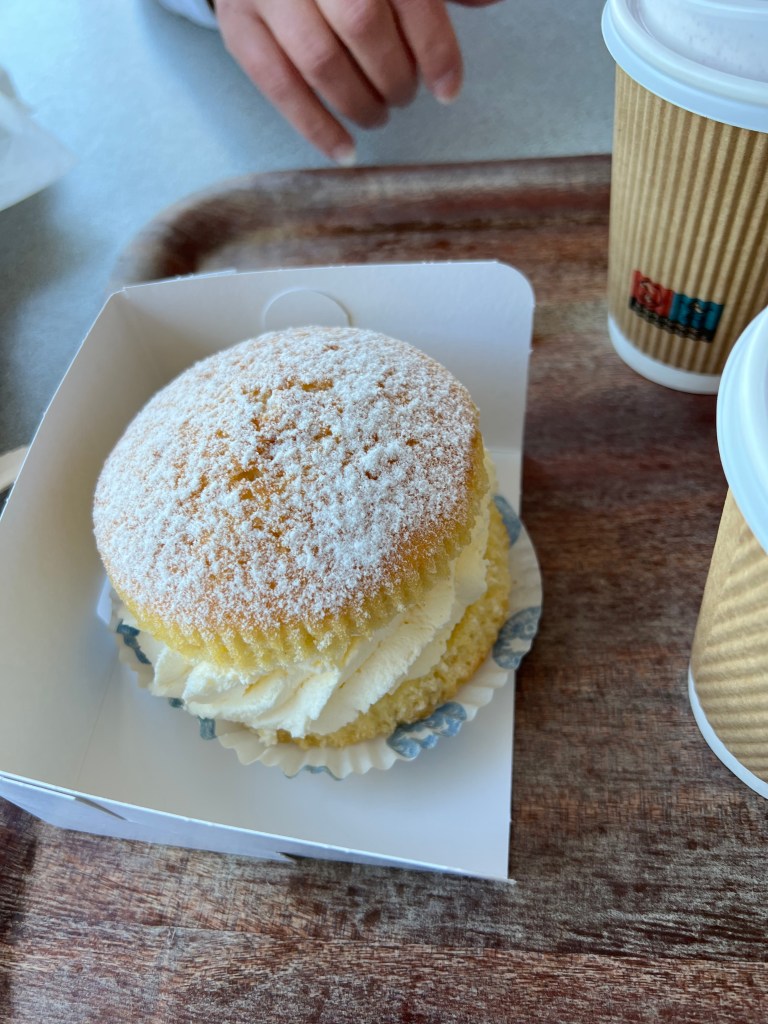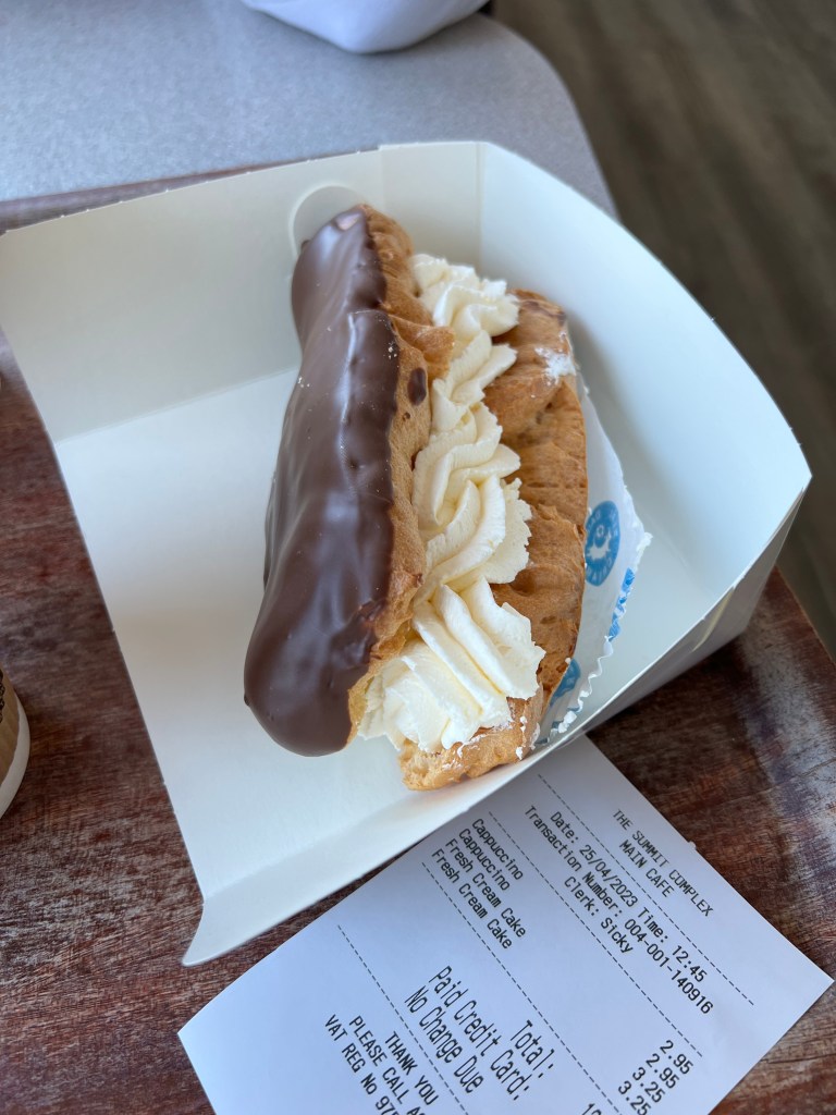 The views of the summit was worth the trip! You had the Irish Sea to the north, the Snowden Mountains to the south and sheep all around. Robin and I took a long look round, then stepped into the cafe. She had a Victoria Sponge with cream filling, I had a chocolate eclair with cream filling. She had her cappuccino, they didn’t have mocha, so I had a cappuccino as well. Life was good!